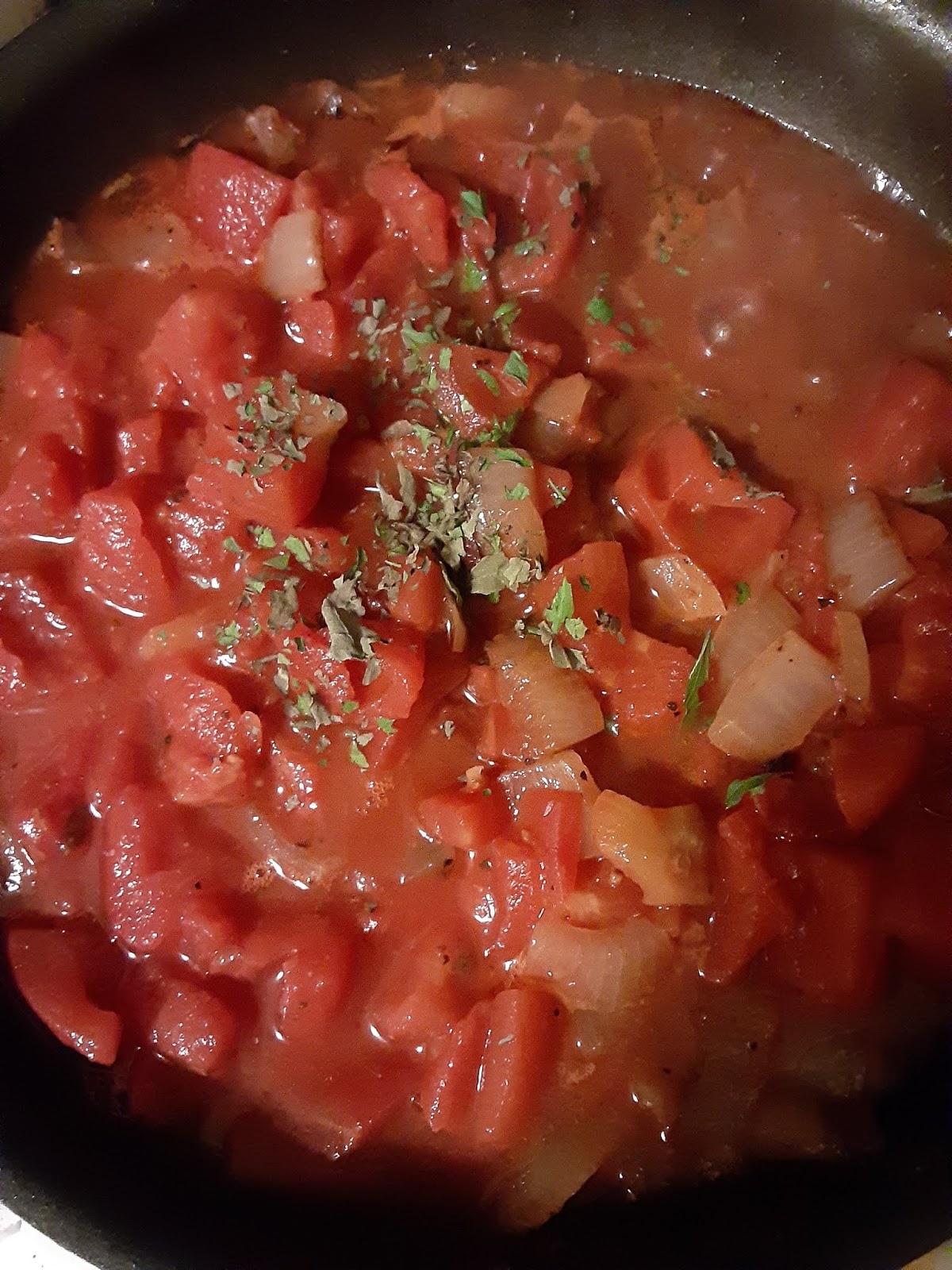 | Step 3: Add chopped tomatoes, basil, and oregano. |