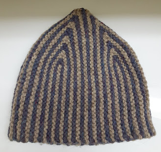 Counterclockwise from the top right: hat of leftover deep blue and the last bit of some handdyed/handspun; the scarf of Aslan Trends "Los Andes"; a hat of Nashua Stripes and some leftover brown; hat of leftover green and some fingering weight wool I dyed, and used doubled; and the bottom center hat is from a ball of Knitting Notions Classic Merino Sport and some random pink/multi from the stash (I'd planned to use a different pattern but the yarns blended too much so I just did garter stripes). On the bottom right is a partly done hat, somebody did the center part and it cupped, so I decided to add sides and turn it into a hat. For a long time it was a decoration at MakeHartford for the String Thing area, and when MH closed I brought anything not wanted home and finally have been going through the last bag of yarn and bits. My addition is in a very close shade of green, but just single crochet, not entrelac Tunisian. Or any Tunisian.